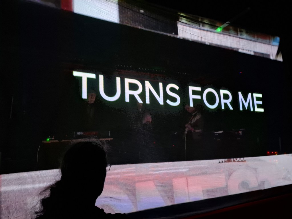 As I moved to the front of the room, I was struck by another crucial element of the band’s persona. Hanging in front of the stage was a screen of material, onto which they project a series of captivating images and lyrical vignettes throughout the whole show. You can see the silhouettes of the band through this screen, you can watch them move and dance, see the ways in which they interact, but they remain removed from the audience in a way that feels different to anything I’ve seen before. It’s such a simple and effective way of setting up a stage, that I can’t believe it’s the first time I’ve seen such a thing.