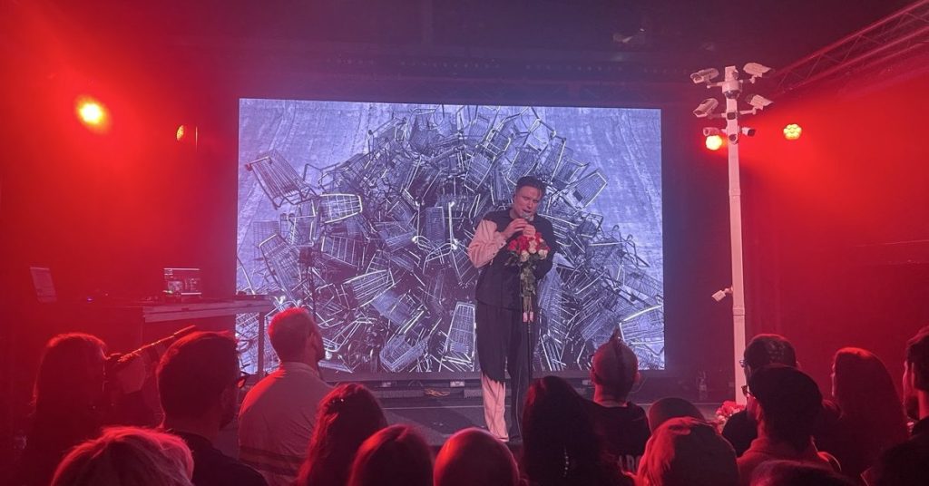 I think Balfe does too, because he sits on the ground for the next act – ‘three stories, three people’ and goes through a couple of monologues called ‘Brendan’ and ‘Aaron’, the latter of which I recognise from the excellent YouTube mixtape he put out around the first album. I’m very pleased to hear it here. And the third of these stories is new album highlight ‘The Ox’, featuring real footage of the boxer of the title. Then suddenly, the final act is already upon us. He’s back to hurrying out words like the end is near on ‘Top Scheme’ which is backed by its incredibly detailed video (I’m pretty sure at one point the name of an author appears on screen with the words ‘READ HER WORK’ which, added to the information overload, has the slight feel of that It’s Always Sunny board meme – but I’m here for it), and then ‘You Live’ and ‘Birthday / The Pain’ bring the set to a close, with a message for anyone experiencing pain to leave a little of it in the room tonight.